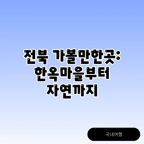 전북 가볼만한곳: 한옥마을부터 자연까지, 다채로운 매력 2025년 07월 01일 by 방방곡곡 한국여행 베이스캠프 목차 ▼ Home 카테고리 없음 전북 가볼만한곳: 한옥마을부터 자연까지, 다채로운 매력 전북 가볼만한곳: 한옥마을부터 자연까지, 다채로운 매력메인 콘텐츠 생성 실패같이보면 좋은 글! 👉경북 가볼만한곳: 역사와 자 👉경남 가볼만한곳: 자연 속 👉순천 가볼만한곳: 순천만 국 공유하기 게시글 관리 방방곡곡 한국여행 분류 전체보기