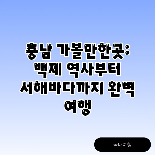 충남 가볼만한곳: 백제 역사부터 서해바다까지 완벽 여행 2025년 07월 01일 by 방방곡곡 한국여행 베이스캠프 목차 ▼ Home 카테고리 없음 충남 가볼만한곳: 백제 역사부터 서해바다까지 완벽 여행 충남 가볼만한곳: 백제 역사부터 서해바다까지 완벽 여행메인 콘텐츠 생성 실패같이보면 좋은 글! 👉경북 가볼만한곳: 역사와 자 👉군산 가볼만한곳: 근대 역사 👉태안 가볼만한곳: 서해바다 공유하기 게시글 관리 방방곡곡 한국여행 분류 전체보기